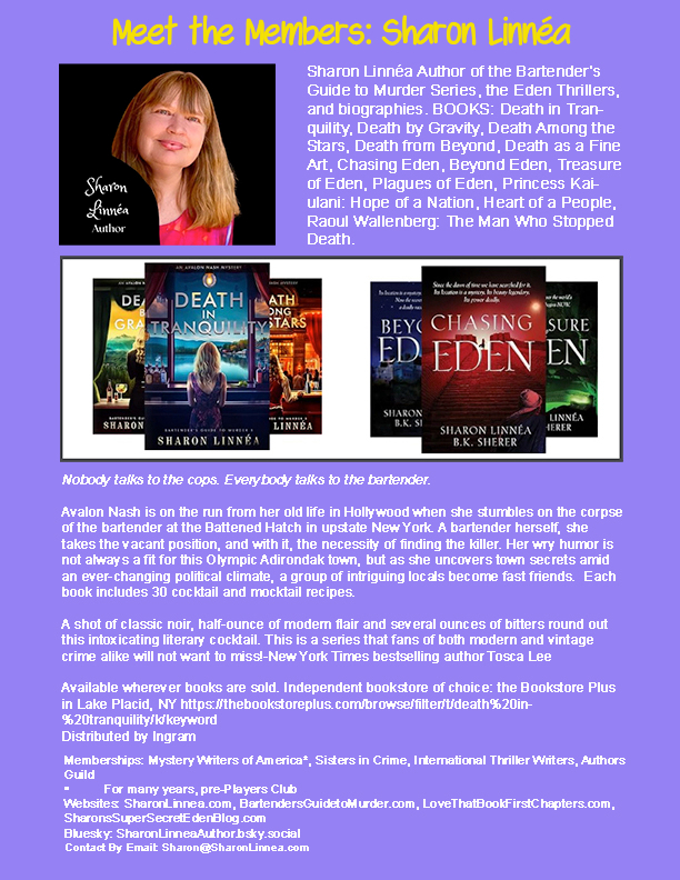 Welcome to Meet the Members, a regular “one sheet” highlight of our members. Today we’re featuring author Sharon Linnéa. You can read about her below and on the flyer! Sharon Linnéa Author of the Bartender’s Guide to Murder Series, the Eden Thrillers, and biographies. BOOKS: Death in Tranquility, Death by Gravity, Death Among the Stars, Death from Beyond, Death as […]