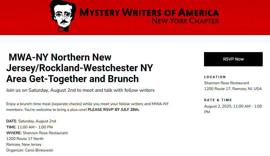 Enjoy a brunch-time meal (separate checks) while you meet your fellow writers and MWA-NY members. You’re welcome to bring a plus-one!