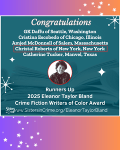 Christal Roberts was named a runner-up for the 2025 Sisters in Crime Eleanor Taylor Bland Crime Fiction Writers of Color Award for her unpublished novel A Killing in Black Newport. Set in a fictional Rhode Island seaside getaway for wealthy Black vacationers, nicknamed ‘Black Newport,'” the novel follows a disgraced Black journalist who finds the dead body of a former source in a Gilded Age ruin. When she doesn’t call the cops, she must overcome a hostile editor, angry locals, and her own toxic mother to find the killer and get the scoop of a lifetime.