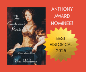 Nina Wachsman’s third novel in the Venice Beauties mysteries, The Courtesan’s Pirate (September 2024), has been nominated for an Anthony for Best Historical. The series is set in 17th century Venice, and this latest entry features a former Venetian courtesan who travels to the Caribbean to rescue her pirate lover.