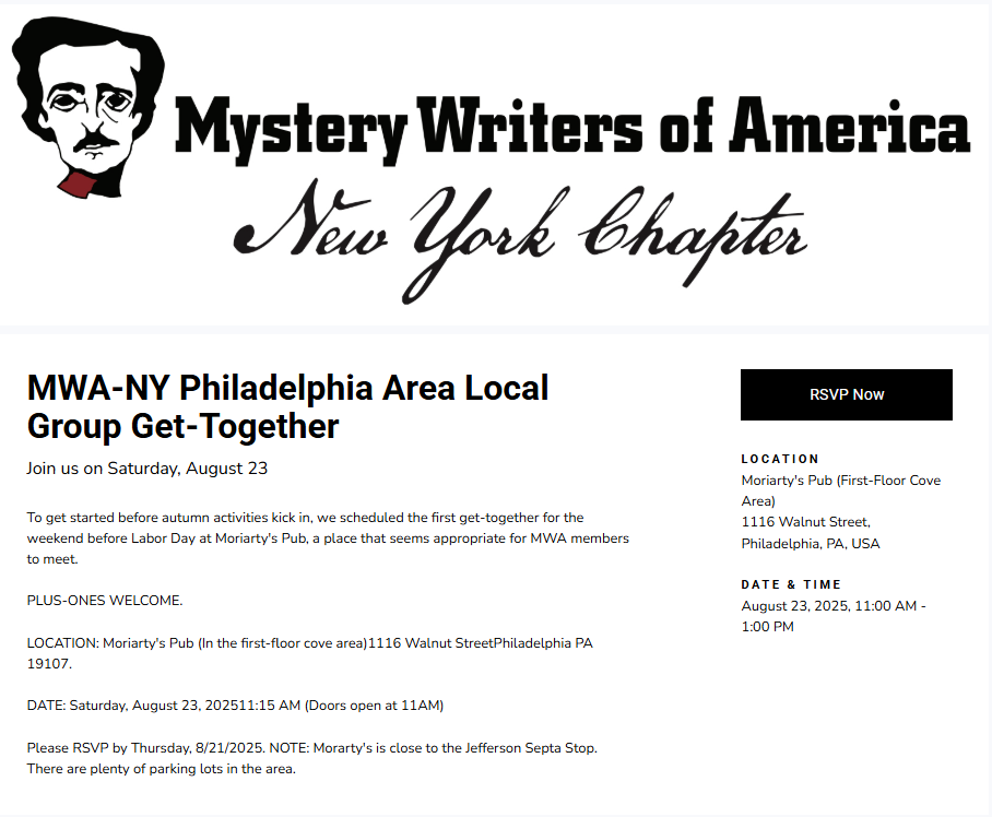 To get started before autumn activities kick in, we scheduled the first get-together for the weekend before Labor Day at Moriarty’s Pub, a place that seems appropriate for MWA members to meet. PLUS-ONES WELCOME. LOCATION: Moriarty’s Pub (In the first-floor cove area)1116 Walnut StreetPhiladelphia PA 19107. DATE: Saturday, August 23, 202511:15 AM (Doors open at 11AM) Please RSVP by Thursday,
