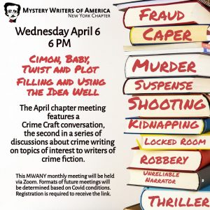 The next chapter meeting will feature the second in the new series of Crime Craft discussions, this time on the theme of “C’mon Baby, Twist and Plot: Filling and Using the Idea Well.” The event is free but registration is required.