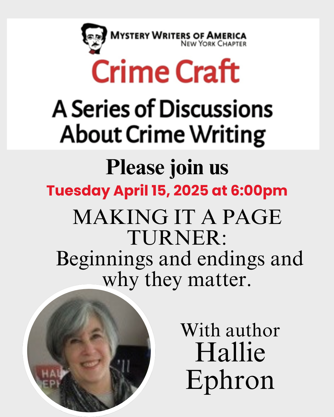 At this month’s Crime Craft, Hallie Ephron will be discussing the topic MAKING IT A PAGE TURNER: structuring (back and front) story, chapters, and scenes to keep readers from turning out the lights. Beginnings and endings and why they matter, HALLIE EPHRON (http://hallieephron.com) is a NY Times bestselling author of sixteen books, including eleven mystery novels and the Edgar-nominated WRITING AND SELLING YOUR MYSTERY NOVEL. Lee Child called it “the best how-to guide I have ever seen.” Her NEVER TELL A LIE was adapted for film. She is a five-time finalist for the Mary Higgins Clark Award. For twelve years she wrote the Boston Globe’s “On Crime,” column, winning an American Crime Writers League award for book reviewing. She teaches at writing workshops and conferences in the US and abroad and blogs daily at Jungle Red Writers.