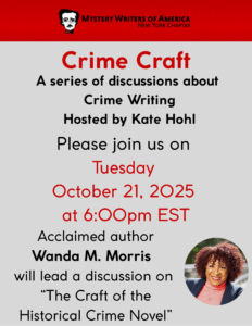 Join host Kate Hohl for “The Craft of Historical Crime Fiction” with acclaimed author Wanda M. Morris on Tuesday, October 21, at 6:00pm EST via Zoom.
