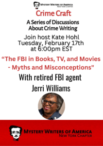 Join host Kate Hohl on Tuesday, February 2/17, at 6:00pm EST for the February Crime Craft with retired FBI Agent Jerri Williams: “The FBI in Books, TV and Movies – Myths and Misconceptions.”