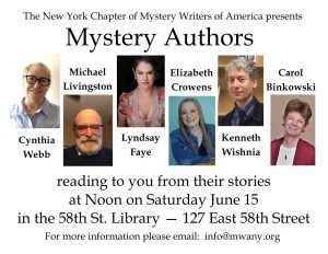Six authors will take the spotlight at the next Manhattan Mystery Reading: Saturday June 15, starting at noon at the 58th Street Library, 127 East 58 St.