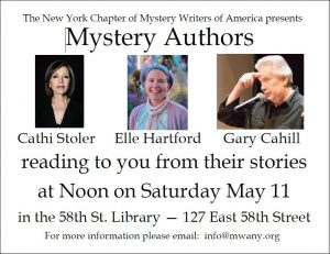 Mystery authors Cathi Stoler, Elle Hartford, and Gary Cahill read to you from their stories beginning at noon on Saturday, May 11, at the East 58th Street branch of the New York Public Library (127 East 58th Street, between Lexington and Park Avenues). For more information please email: info@mwany.org.