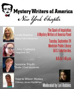 Where does the idea for a mystery come from? Is the story triggered by a news article, a real-life crime or a dream? Are there any particular places or incidents that you draw on when you find yourself with writer’s block? This panel discussion with four mystery authors will provide insight into inspiration. Venue: Montclair Public Library, 50 South Fullerton Avenue, Montclair, NJ.