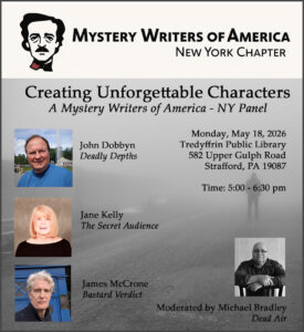 Join us for “Creatiing Unforgettable Characters,” a Mystery Writers of America New York Panel, from 5:00 to 6:00 p.m. on Monday, May 18, at the Tredyffrin Public Library, 582 Upper Gulf Road, Strattford, Pa.